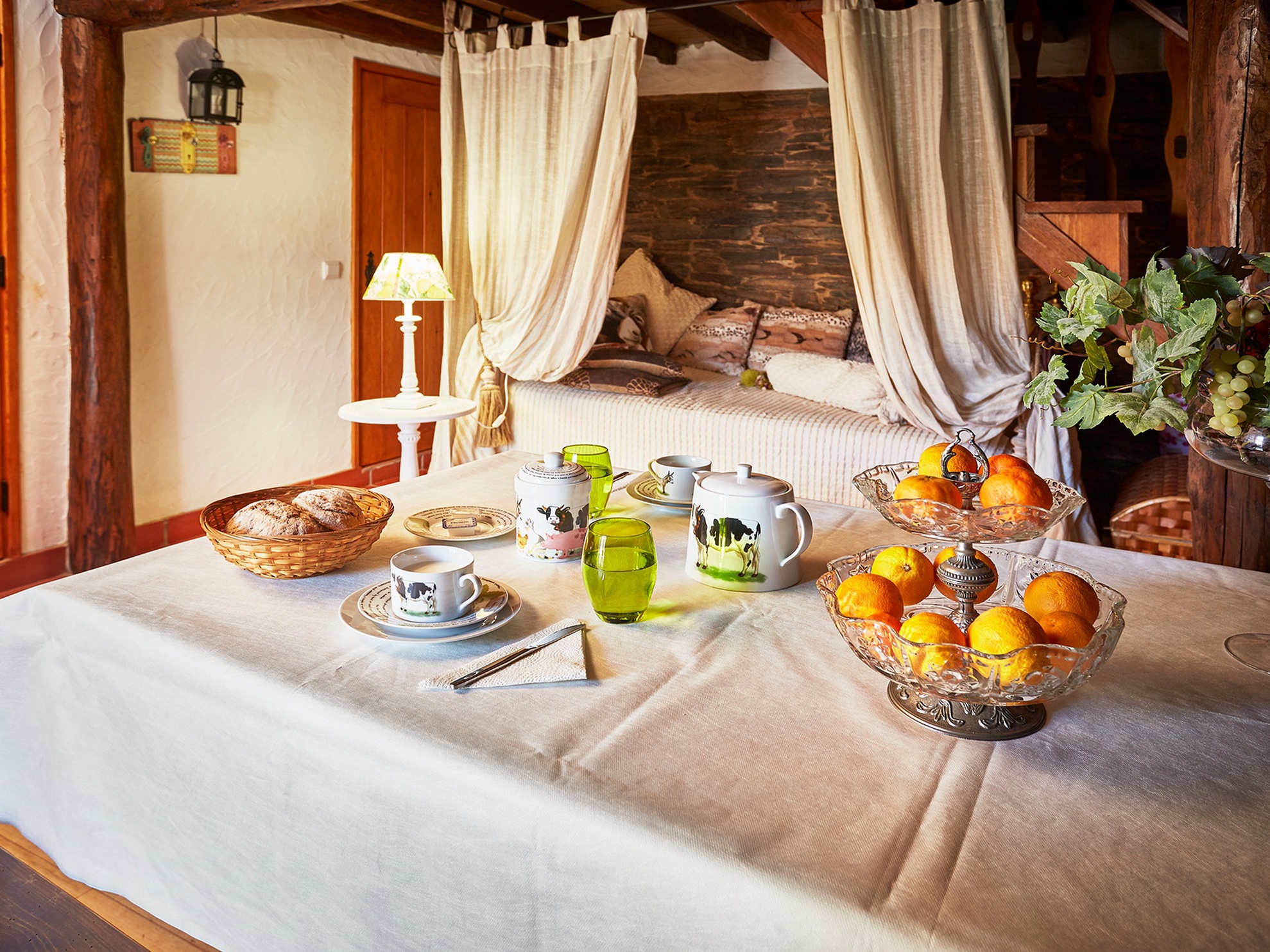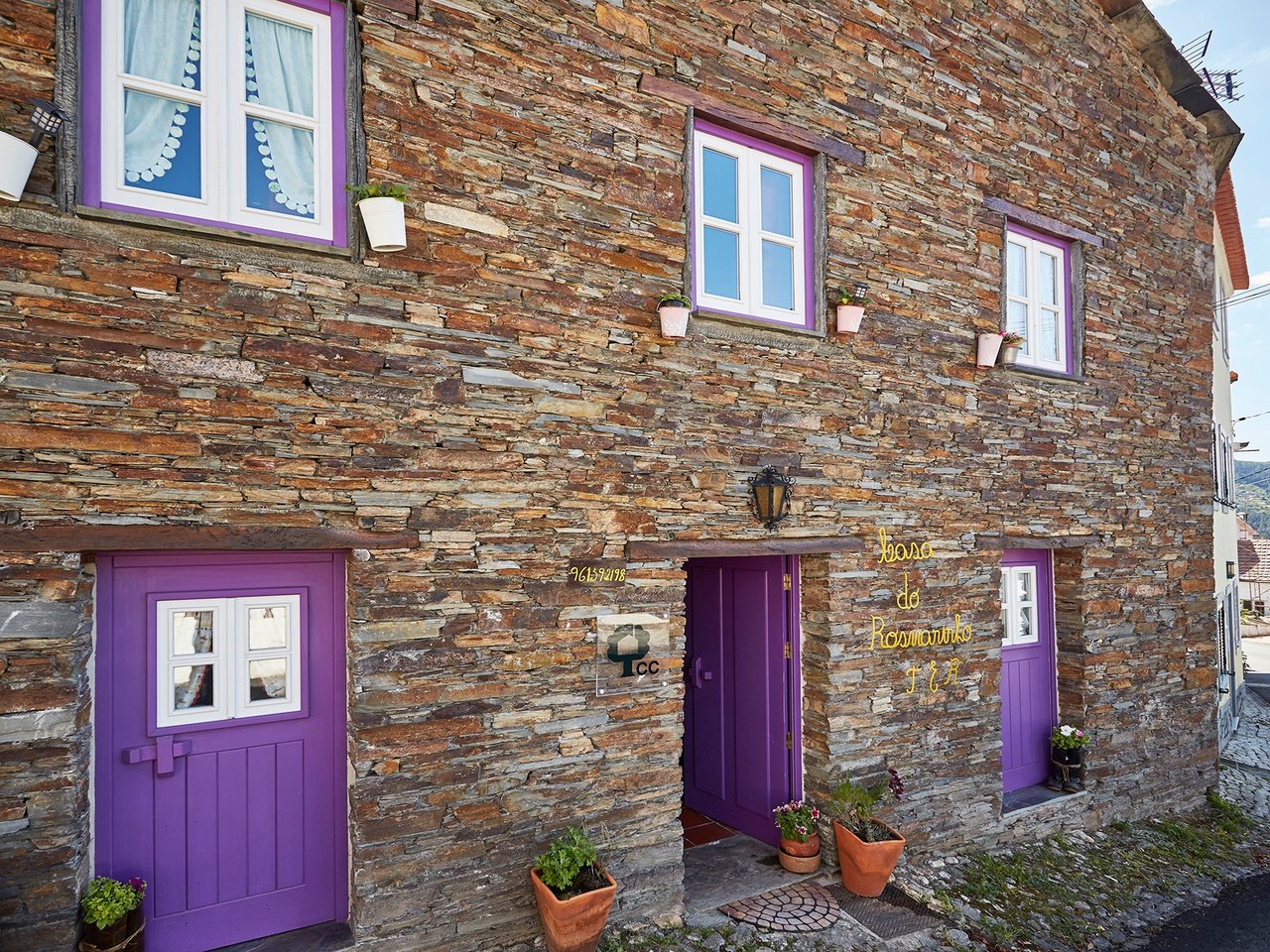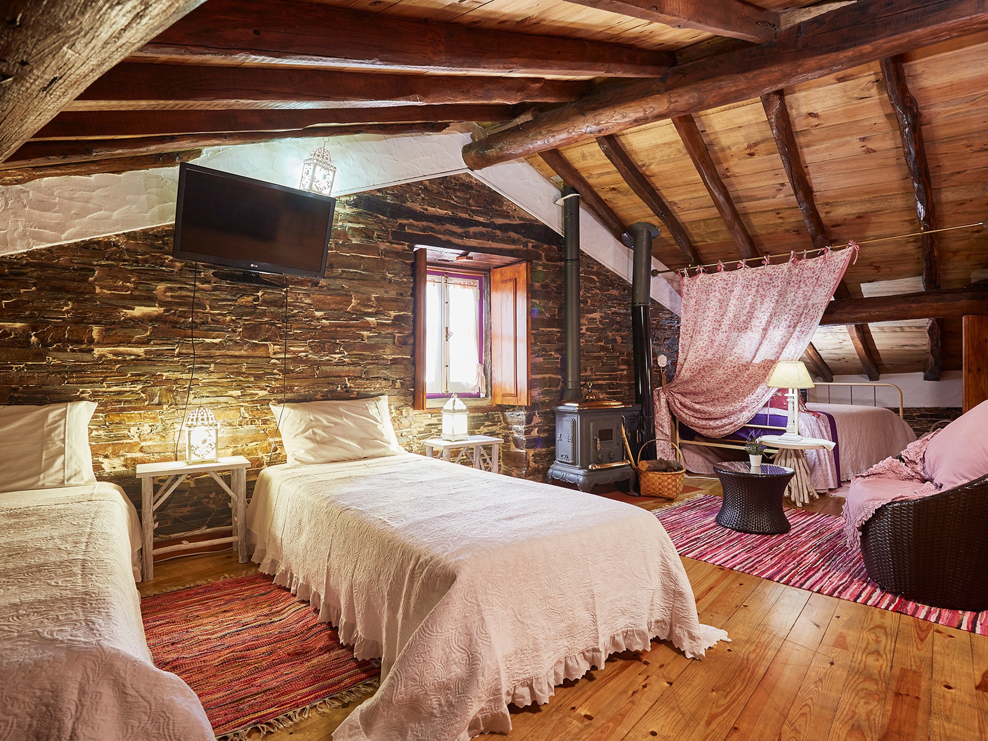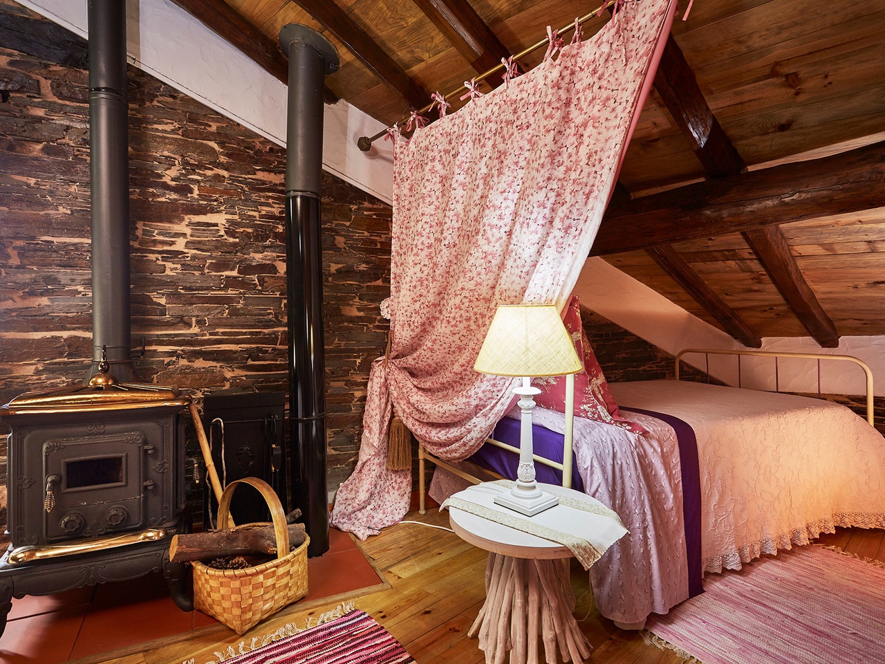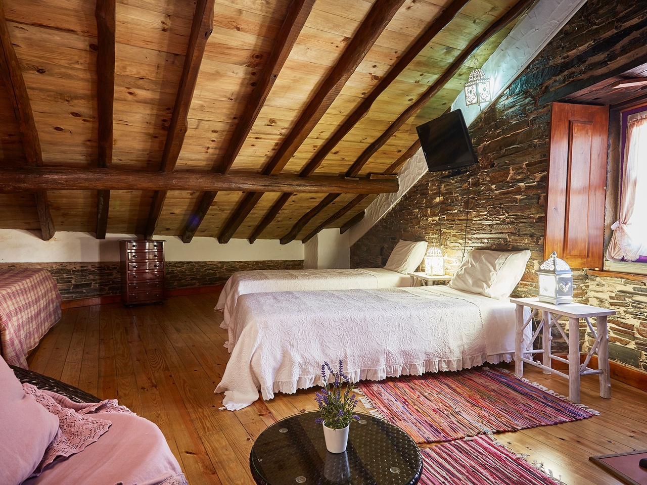 On the 2nd floor there is a large bedroom with several beds and an en-suite bathroom. The walls are of schist, the ceiling and floor are wooden. There is a wood stove for heating and two windows with panoramic views to the Açor hills. There are stoves on all floors.
