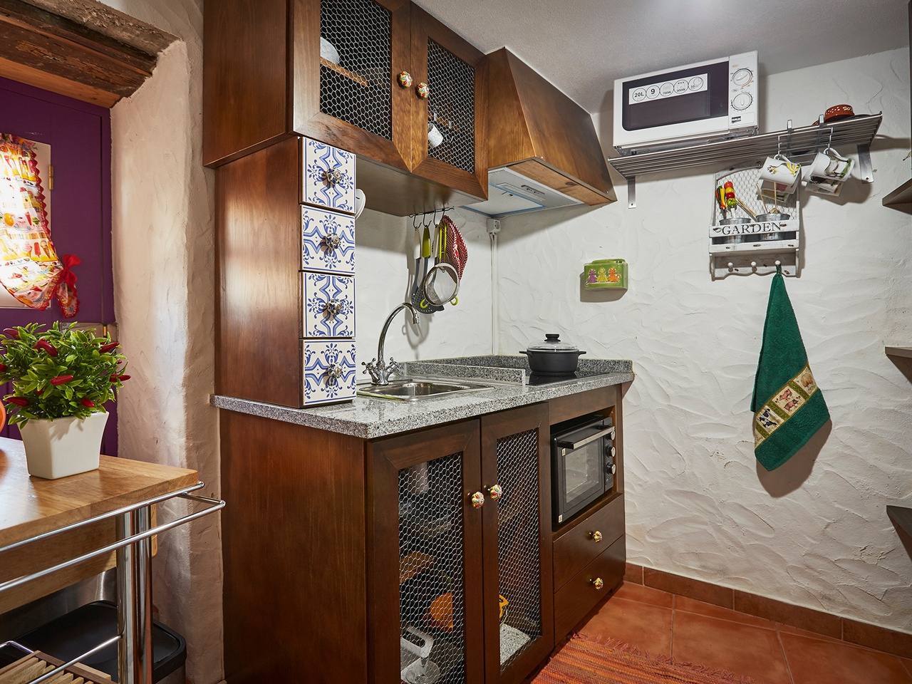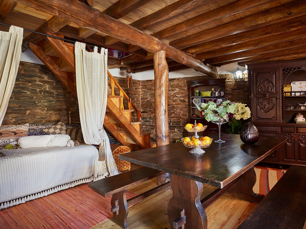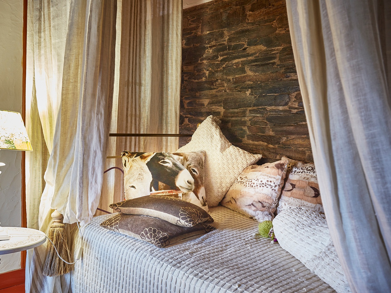 On the first floor there is a hall, living room with television, double bedroom with a cot, bathroom and fully equipped kitchen. The bedroom is large, with a comfortable bed, especially designed by the designer of the restoration project, with a large cot, schist walls and wooden floor and ceiling, wardrobe and two large windows.