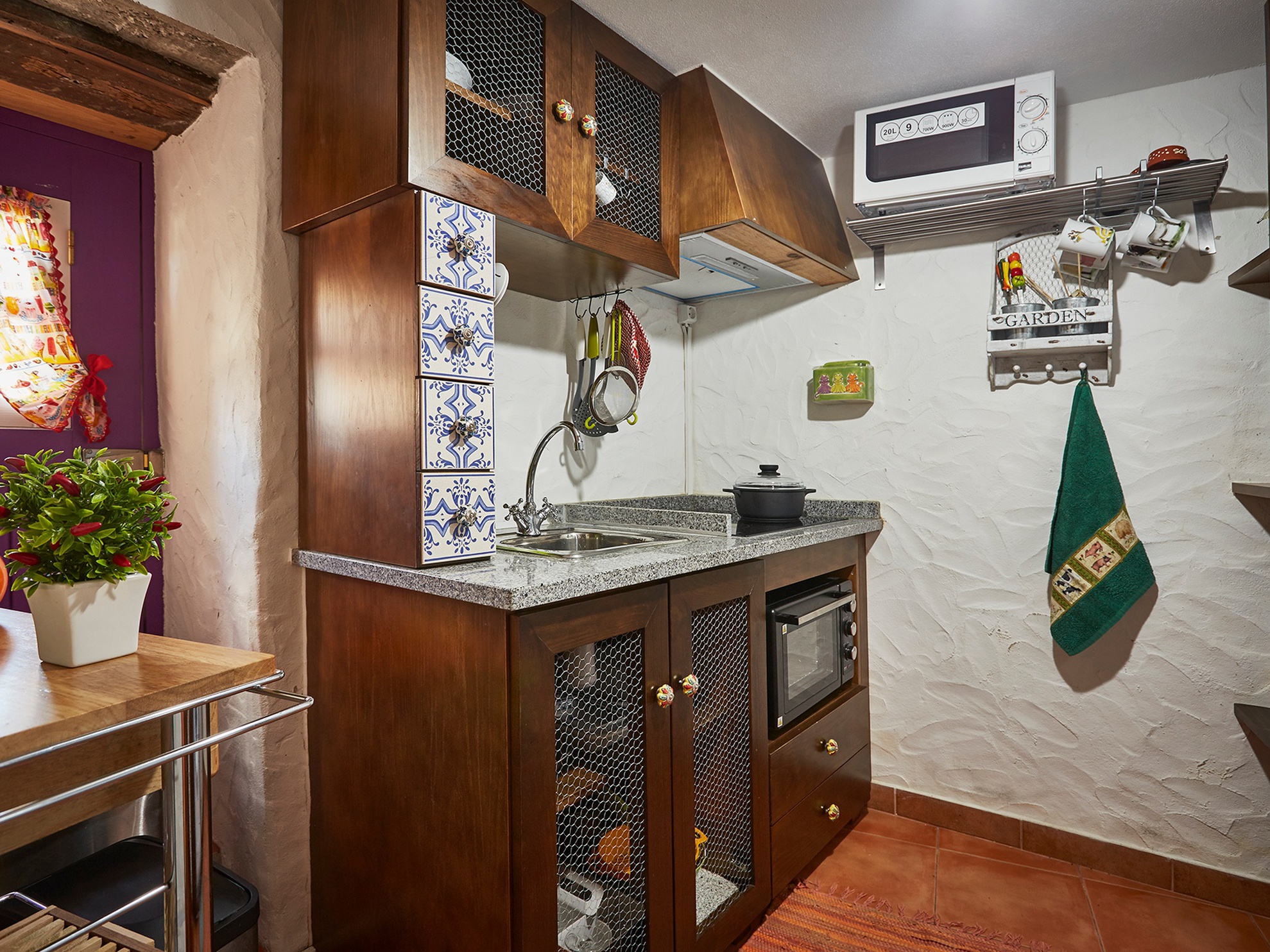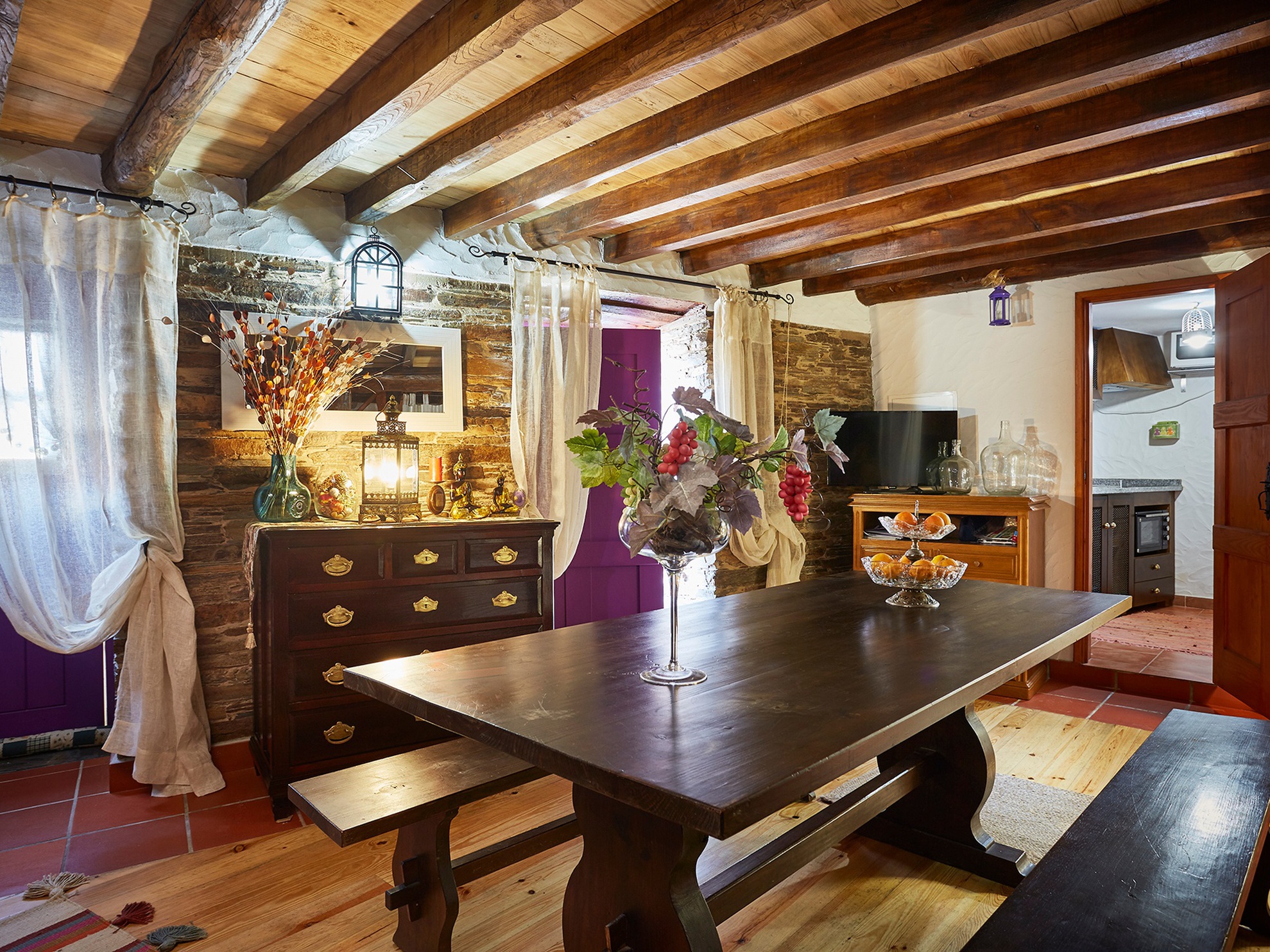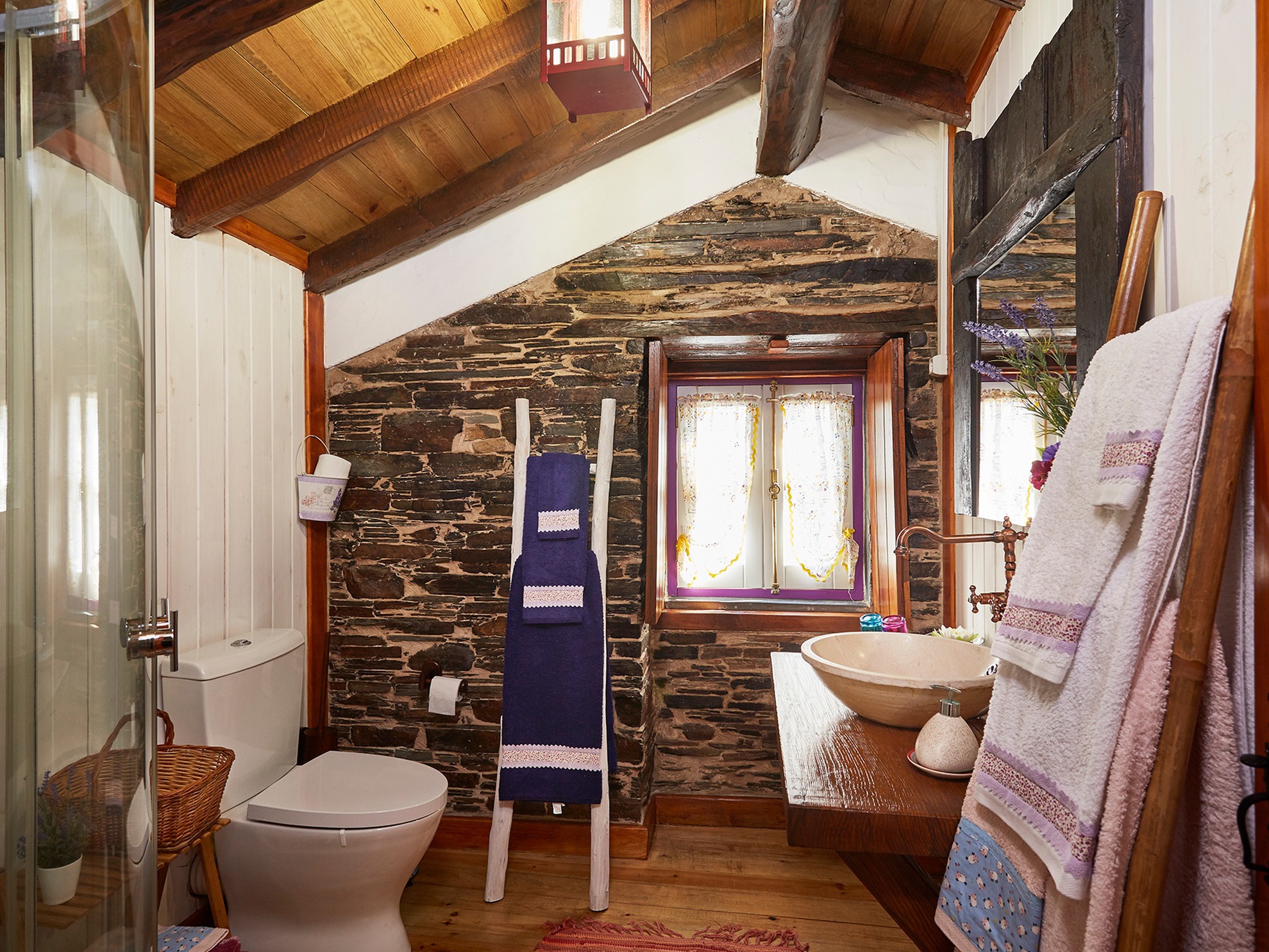 On the first floor there is a hall, living room with television, double bedroom with a cot, bathroom and fully equipped kitchen. The bedroom is large, with a comfortable bed, especially designed by the designer of the restoration project, with a large cot, schist walls and wooden floor and ceiling, wardrobe and two large windows.