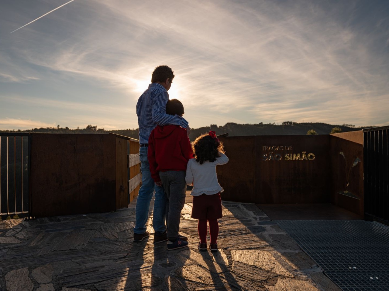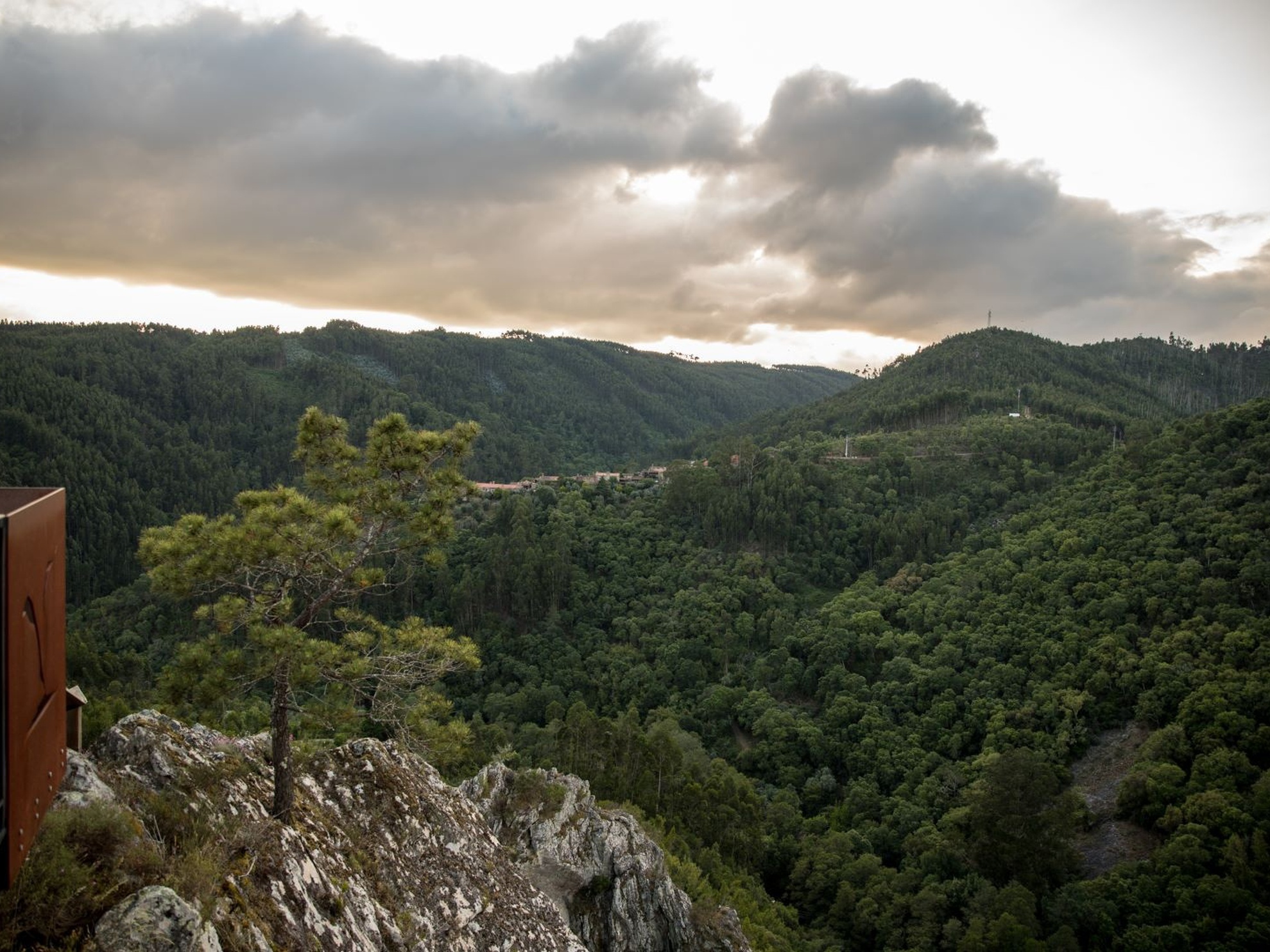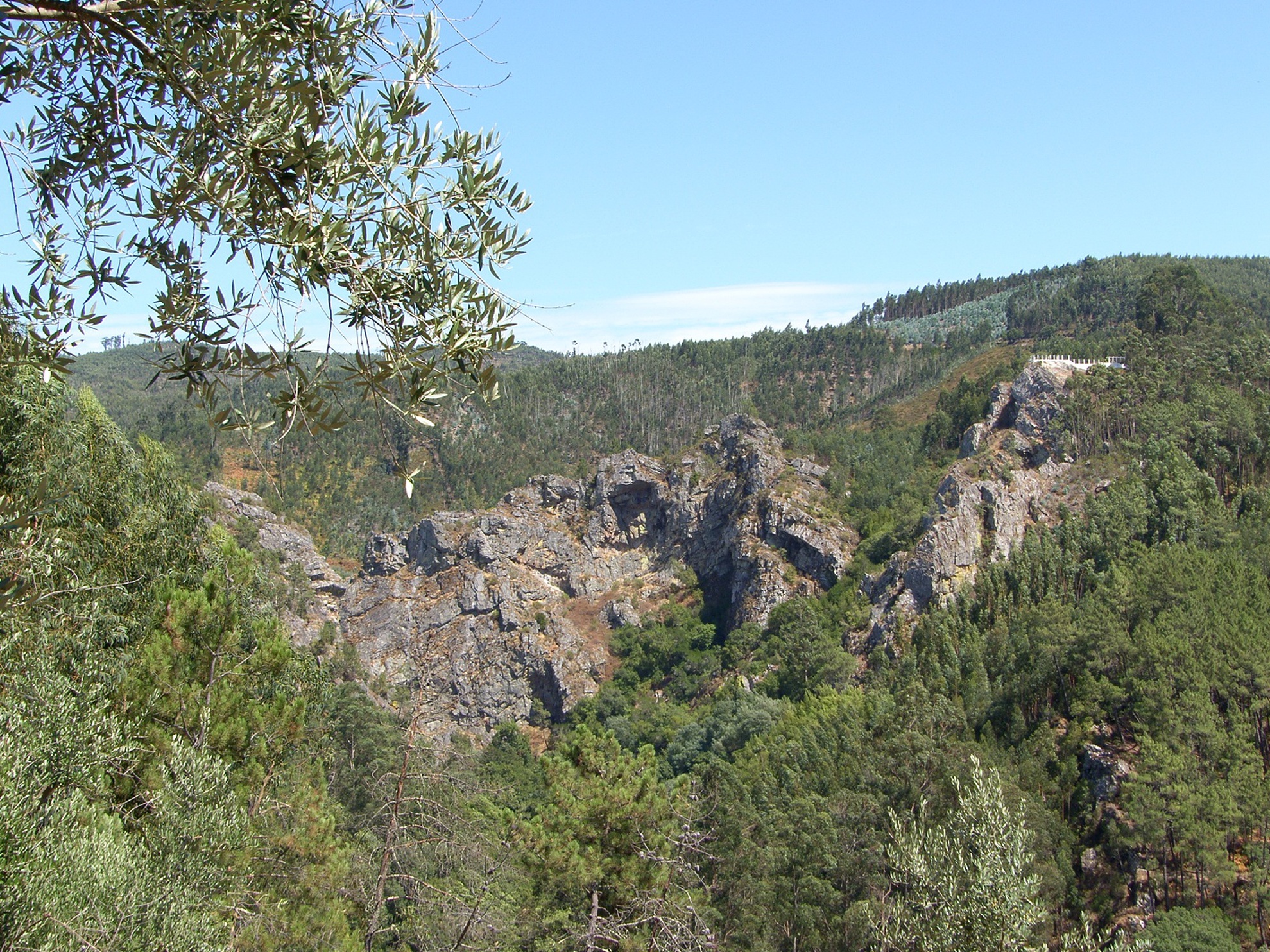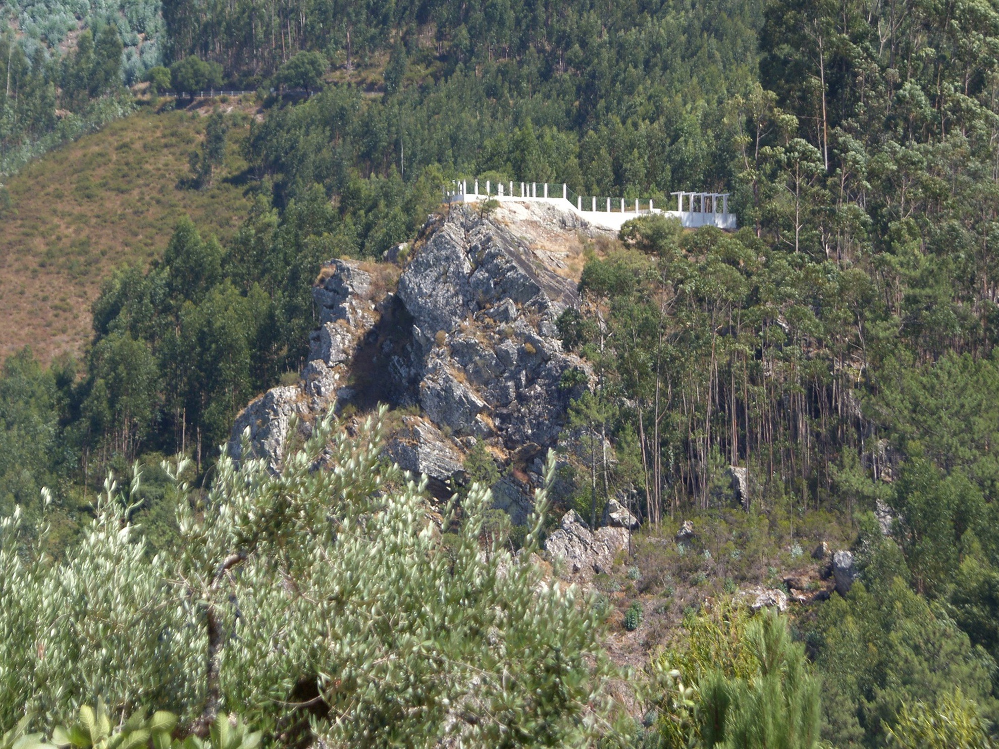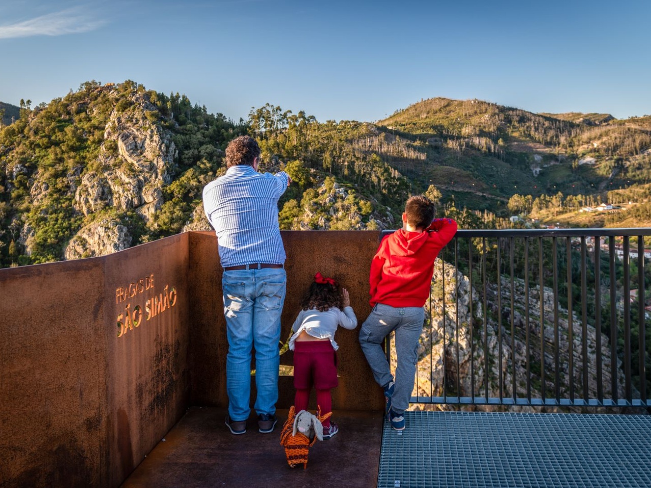 Landscape reader: O: Aldeia do Xisto of Casal de São Simão | N: Fragas de São Simão and, at the bottom of the valley, the course of Ribeira de Pera | NE: IC8 bridge and, on the horizon, the Lousã Mountain.