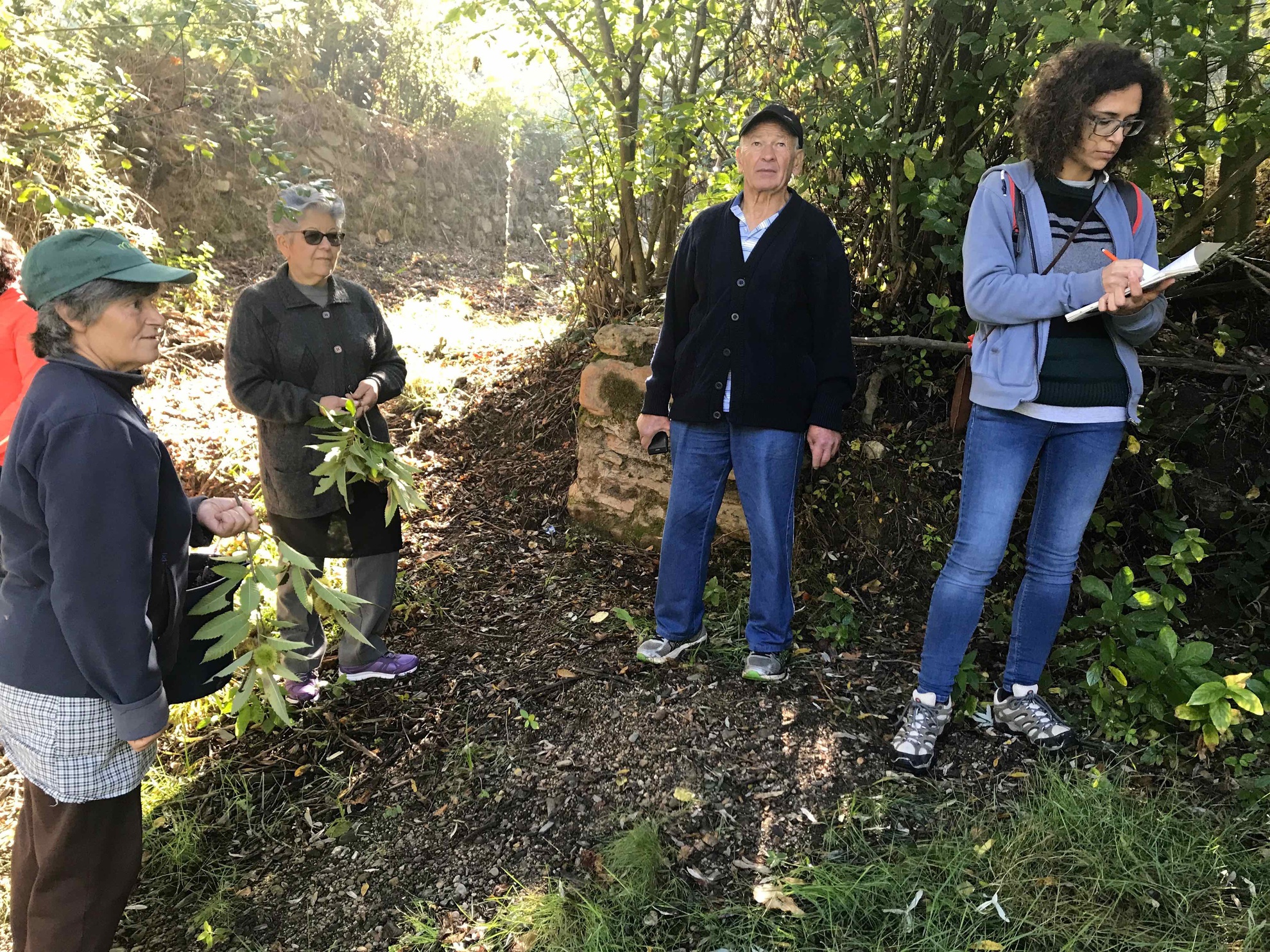 The walk is slow, such is the enthusiasm with which the group debates each plant they find along the way. And the knowledge just keeps pouring in. The scent of wild mint suddenly fills the air, and Lurdes hastens to say that in the old days, when there were many mosquitoes, it was enough to put a sprig in each ear to prevent bites. There are no mosquitoes, so nobody tries this, but the image remains. Let’s carry on! Pimpernel is good for colds. Wild spinach is a very versatile and tasty delicacy in the kitchen. The flax-leaved daphne, cut at the stem and stuck in the ground, keeps moles away. If we give the animals a genistae (broom) infusion bath, we help them get rid of parasites. Ivy combats hair loss and dandruff.