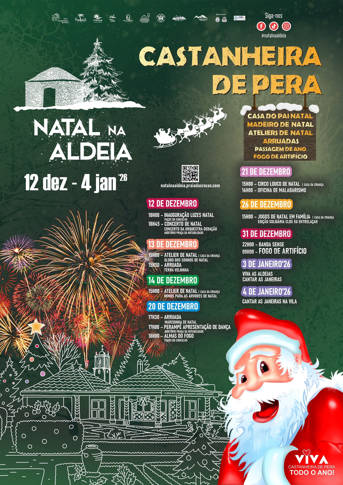 De 12 de dezembro a 4 de janeiro, Castanheira de Pera volta a vestir-se de magia com o Natal na Aldeia ’25, uma iniciativa que celebra as tradições, a criatividade e o encanto desta época festiva. Ao longo de várias semanas, a vila transforma-se num cenário natalício feito de luzes, música, oficinas, animação de rua, arruadas e momentos familiares, com destaque para a Casa do Pai Natal, o Madeiro, os Ateliers de Natal, as celebrações de Passagem de Ano e o habitual espetáculo de fogo de artifício.
