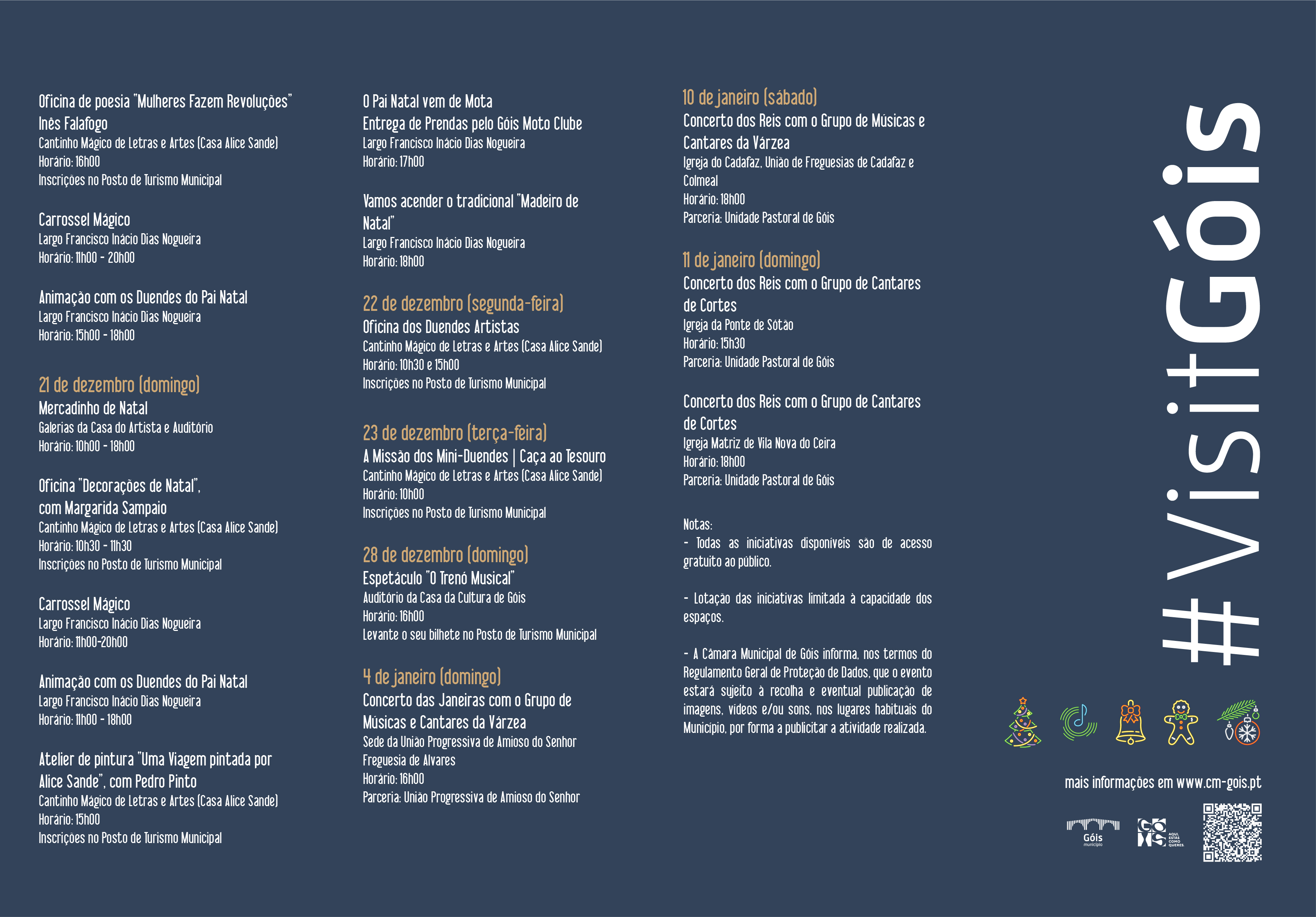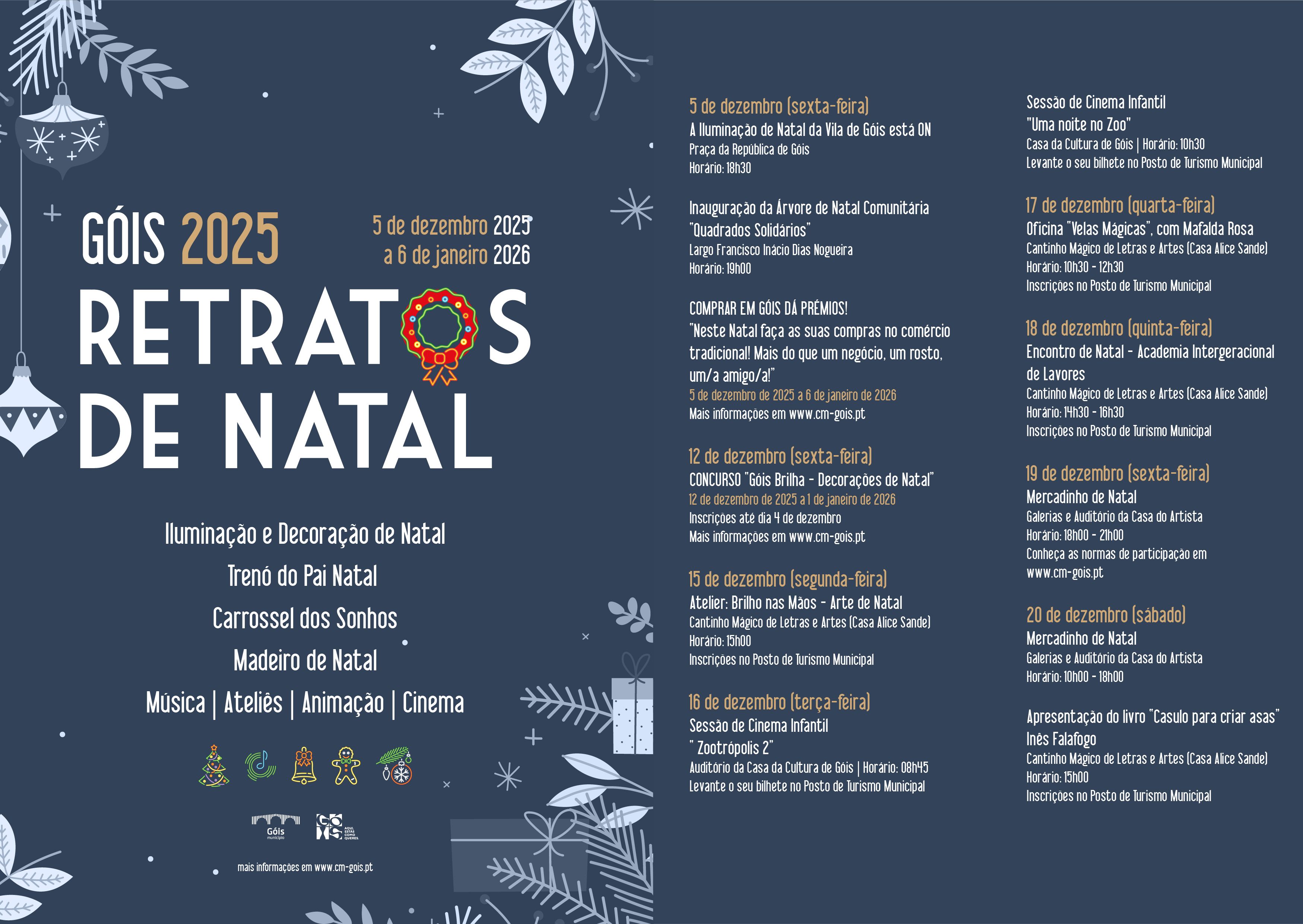 A iniciativa “Retratos de Natal”, promovida pelo Município de Góis, promete animar o concelho entre 5 de dezembro e 6 de janeiro. O programa inclui o tradicional mercadinho, música, workshops, gastronomia, o concurso Montras de Natal, o carrossel, o Pai Natal e Duendes, e muito mais.