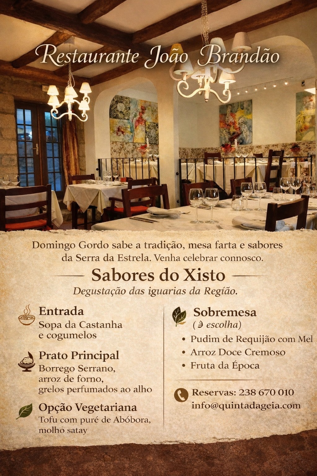 O Restaurante João Brandão, no Hotel Rural Quinta da Geia, convida a celebrar a tradição à mesa com a iniciativa Sabores do Xisto, uma degustação dedicada às iguarias típicas da Serra da Estrela, onde a autenticidade dos produtos regionais se cruza com a hospitalidade característica do território.