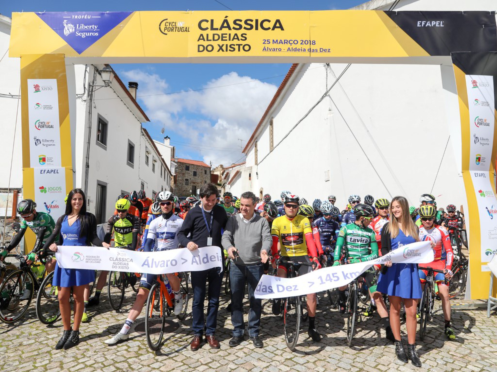 São 10h00 do dia 25 de março de 2018. Chegámos a Álvaro, em Oleiros, onde se dá a partida simbólica da Clássica Aldeias do Xisto. Dentro de duas horas, 19 equipas, portuguesas e espanholas, e cerca de 130 ciclistas vão atravessar as Aldeias do Xisto e pedalar 145 quilómetros, até à Aldeia das Dez, em Oliveira do Hospital, disputando o Troféu Liberty Seguros.