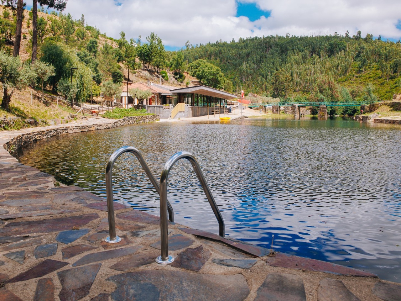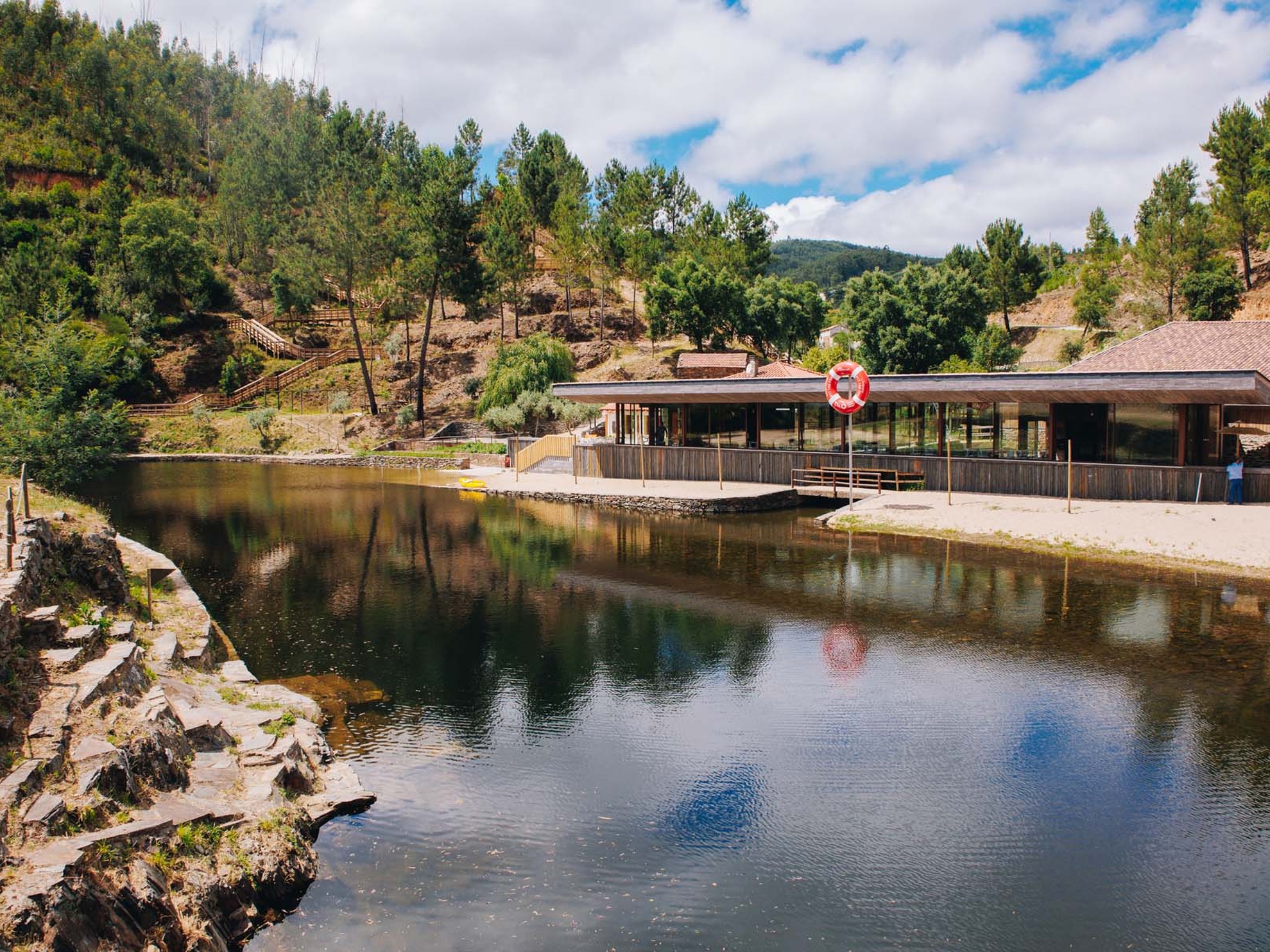 O espaço foi desenvolvido a pensar nas crianças, através da implementação de uma zona fluvial de baixa profundidade e de um pequeno parque infantil.